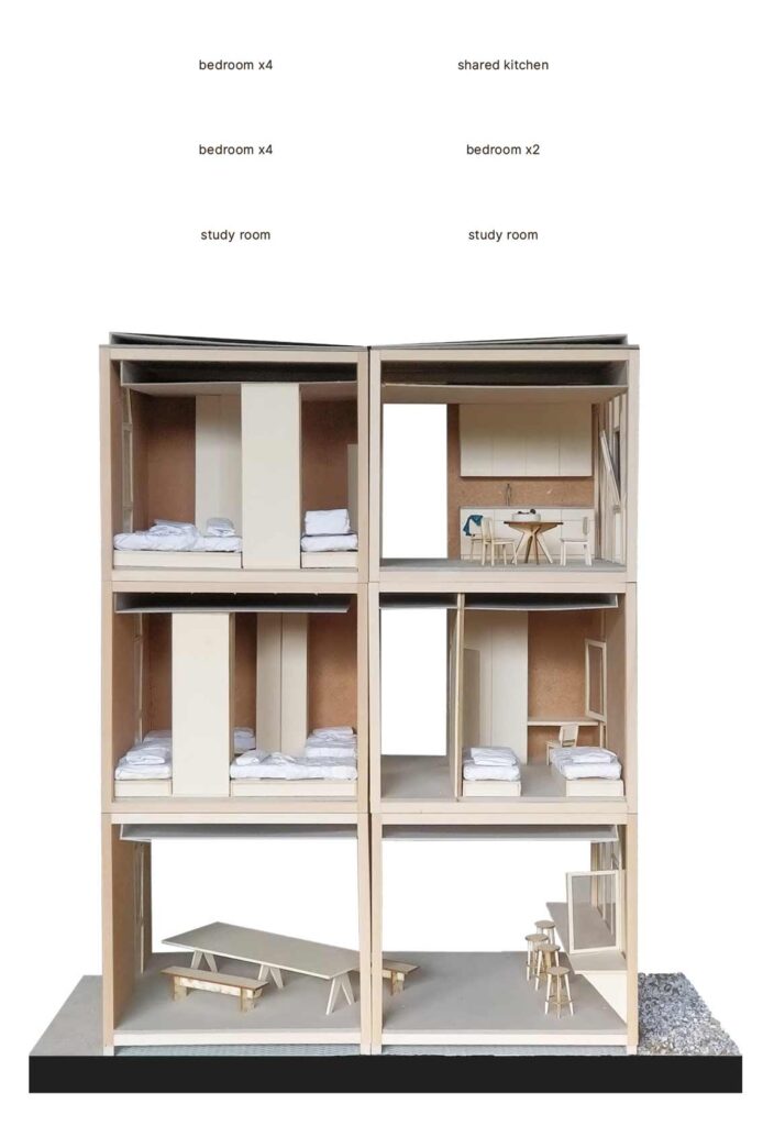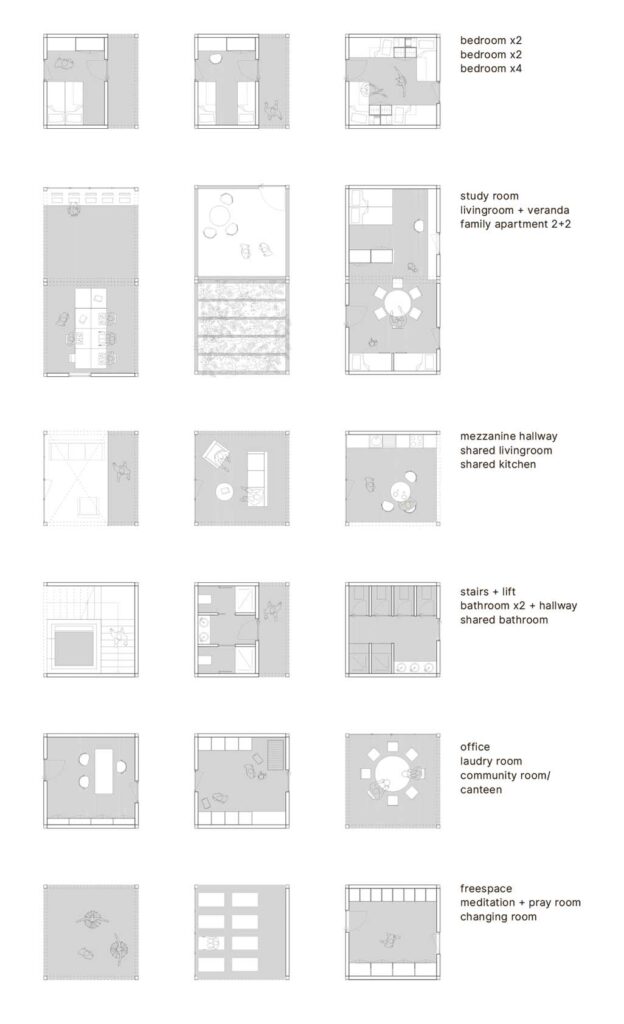 WORDS – A small group of modules made with the right ‘letters’ (bedrooms, restrooms, kitchen, living room) guarantees that everybody has access in a short distance to all the primaries services.
