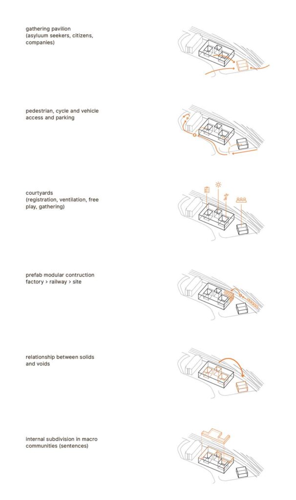 The wide range of stay periods of asylum seekers (1 day – 3 months) and the demand of prompt solutions to manage the migration issue, were the main leading topics our design process. Modular and economic building system allowed us to define an architecture storytelling, that helps in the best way the temporary residents, avoiding big technical issues.
